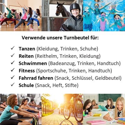 Ein Turnbeutel der Extra-Klasse – freu dich auf besondere Eigenschaften und überragende Qualität!Unser Beutel hat alles, was du dir wünschstFester Zugverschluss: Schnelle und einfache Bedienung mit hohen Sicherheitsaspekt! So schnell kommen keineflinken Finger an deine Gegenstände.Hochwertiger Brustclip: Einfach die Kordel auf der anderen Seite in die vorgesehene Halterung schieben und dieKindergartentasche sitzt sicher auf den Schultern! Dank der verschweißten Seite kannst du den Clip nicht verlieren.Willst du ihn dennoch abmachen, knote einfach das Ende der Kordel auf und zieh ihn runter.Praktischer Tragegriff: Jetzt kannst du den Rucksack schnell packen und einfach an die Garderobe hängen! Sowird deine Beutel-Tasche nicht dreckig und für Ordnung ist gesorgt.Schutz im Dunkeln: Mit dem 1 cm breiten Reflektor-Streifen bist du jetzt auch in Dunkelheit sichtbar!Perfekt auf dem Weg zur Schule an dunklen Wintermorgen oder am späten Abend auf dem Heimweg von Freunden.Individuell anpassen: Knote einfach die Kordel auf und pass die Sporttasche auf deine eigene Körpergröße an.Anschließend die überschüssige Schnur abschneiden – Fertig!Strahlender Druck: Der gestochen scharfe Druck schenkt dir ein atemberaubendes Design! Auch bei intensiverNutzung wird die Farbe keineswegs abbröckeln.Hochwertiges Material: Das strapazierbare Gewebe aus 600D Polyester ist schmutzabweisend und wasserresistent.So eignet sich der Gymback perfekt für eine intensive Nutzung! Leichte Verschmutzung kannst du mit Wasser undSpülmittel entfernen.Überzeug dich selbst von der hohen Qualität und den tollen Extras! Leg einfach die Beuteltasche in deinen Einkaufwagenund erhalte innerhalb weniger Tage 1x Turnbeutel + Brustclip + Tragegriff+ Reflektor. Keine Dekoration enthalten