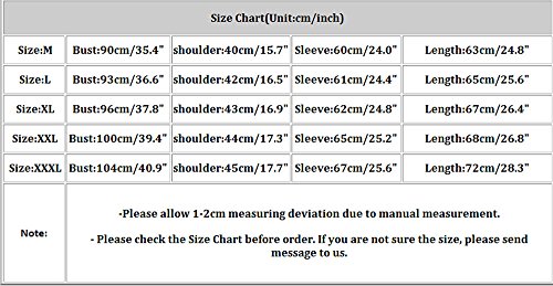 RISIKOFREIER KAUF: niedriger Preis, qualitativ hochwertige Produkte. Kostenloser Rücktausch, Qualitätsservice, bitte seien Sie versichert zu kaufen.Die Standard-Logistik kommt in 12 bis 20 Tagen an und die Express-Lieferung in 1-3 Werktagen.Größentabelle (Einheit: cm / inch) Größe: M Fehlschlag: 90 cm / 35,4 „Schulter: 40 cm / 15,7“ Ärmel: 60 cm / 24,0 „Länge: 63 cm / 24,8“ Größe: L Fehlschlag: 93cm / 36.6 „Schulter: 42cm / 16.5“ Ärmel: 61cm / 24.4 „Länge: 65cm / 25.6“ Größe: XL Fehlschlag: 96 cm / 37,8 „Schulter: 43 cm / 16,9“ Ärmel: 62 cm / 24,8 „Länge: 67 cm / 26,4“ Größe: XXL Fehlschlag: 100 cm / 39,4 „Schulter: 44 cm / 17,3“ Ärmel: 65 cm / 25,2 „Länge: 68 cm / 26,8“ Größe: XXXL Fehlschlag: 104 cm / 40,9 „Schulter: 45 cm / 17,7“ Ärmel: 67 cm / 25,6 „Länge: 72 cm / 28,3″Hinweis:-Bitte erlauben Sie 1-2cm Messabweichung aufgrund der manuellen Messung.- Bitte überprüfen Sie die Größentabelle vor der Bestellung. Wenn Sie sich nicht sicher sind, senden Sie uns bitte eine Nachricht. Eigenschaften:1.Es ist aus hochwertigen Materialien gefertigt, langlebig genug für Ihr tägliches Tragen2. Stil- und Modedesign machen Sie attraktiver3. bequemes material, geeignet für eine vielzahl von anlässen.Produktinformation:Saison: Frühling, Herbst, SommerGeschlecht: MannGelegenheit: lässig, Party, Strand, GeschäftMaterial: BaumwollmischungMustertyp: SolideStil: Casual, Sexy, BusinessHülsenlänge: lange HülseHalsband: gekerbtFit: Fällt der Größe entsprechend ausDicke: StandardWie zu waschen: Handwäsche kalt, aufhängen oder trocknen lassenWas Sie bekommen: 1 * Männeranzug