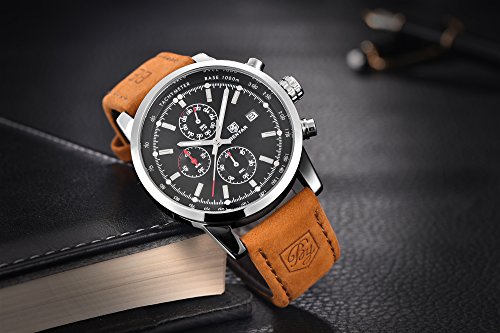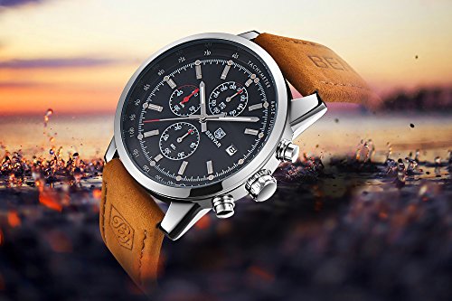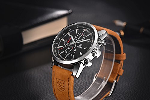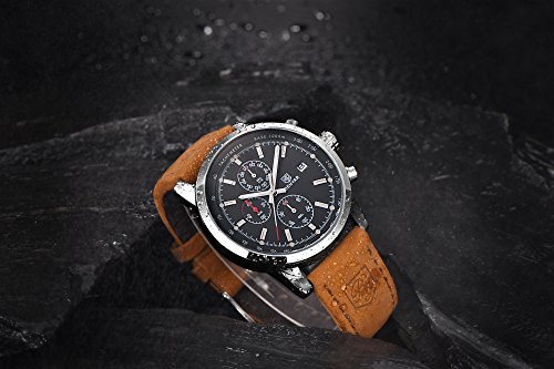 Spezifikation:• Gehäusedurchmesser: + 4,3 cm• Gehäuse Stärke: 0,6 Zoll/1,54 cm• Band Breite: 0.85 inch/2.17 cm• Band Länge: 8,68 inch/22,05 cm.• Band Spange Typ: Schnalle• Band Farbe: braun.• Gewicht der Uhr: 2.51 Oz/71,7 gBitte lassen Sie 0,1-0,2 cm im manuellen Messfehler zu.Material:• Gehäuse Material: Legierung• Band Material: echtes Lederarmband• Spiegelfläche: kratzfeste Mineral GlasPaket:• Watch * 1;• Original-Uhrenkasten * 1;• Bedienungsanleitung * 1;• Garantiekarte * 1Hinweis:• die Farbe kann ein wenig anders durch die Wirkung von Licht.• Bitte drücken Sie keine Tasten im Wasser oder tragen Sie diese Uhr für langjährige Unterwasseraktivitäten.• versuchen Sie nicht, die Uhr in Kontakt mit Dampf und heißem Wasser zu lassen.Was wir bieten ist nicht nur eine Uhr, sondern auch Ihr Streben nach Zeit. Zeit hält nicht nur Ihre süßen Erinnerungen, sondern auch Spuren von eleganten auf der linken Hand…