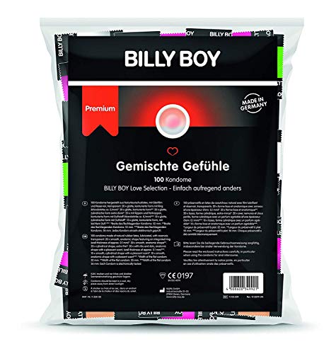 BILLY BOY Gemischte Gefühle – LOVE Selection – Einfach aufregend anders!Ganz nach Liebe, Lust und Laune! Ob stimulierende Rippen & Perlnoppen, festerer Sitz, mehr Freiraum mit zartem Duft oder extra dünn. Diese Sortierung bietet für jeden Liebesrausch die richtige Auswahl!100 Kondome hergestellt aus Naturkautschuklatex mit Gleitfilm und Reservoir, transparent.Gemischte Gefühle bestehend aus:20 x glatte, konturierte Form mit eingearbeiteten Ring (Wandstärke 0,1 mm), Breite des flachliegenden Kondoms: 52 mm20 x glatte, konturierte Form, Breite des flachliegenden Kondoms: 55 mm20 x glatte, zylindrische Form, extra dünn, Breite des flachliegenden Kondoms: 52 mm20 x mit Rippen & Perlnoppen, konturierte Form mit Duftstoff (Wandstärke 0,1 mm), Breite des flachliegenden Kondoms: 56 mm10 x glatte, zylindrische Form mit Duftstoff,Breite des flachliegenden Kondoms: 52 mm10 x glatte, konturierte Form mit Duftstoff, Breite des flachliegenden Kondoms: 56 mmÜber BILLY BOY:BILLY BOY macht Spaß, ist bunt, wild und aufregend anders. Mit unserem breiten Sortiment an Kondomen, Gleitgelen sowie Toys richten wir uns an junge Menschen, die ihre Lust an der Liebe leben – frei, selbstbewusst und sicher.BILLY BOY ist eine Qualitätsmarke – langjährige Herstellerkompetenz kombiniert mit hoher Produktqualität! Alle BILLY BOY Kondome aus Naturkautschuklatex sind „Made in Germany“.BILLY BOY bietet alles, was anmacht und unterstützt das Liebesspiel aufregend anders.