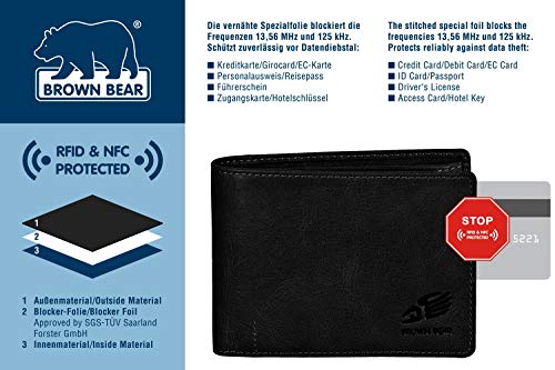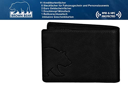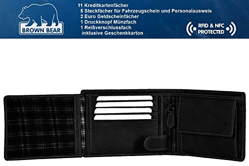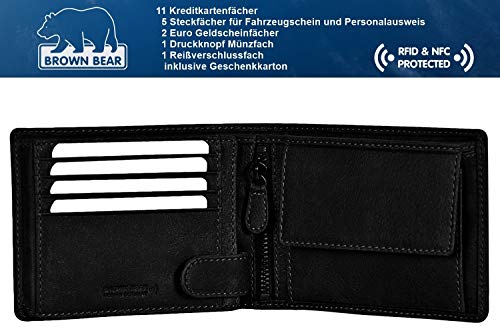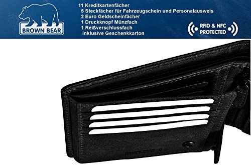 Hochwertiges Männer Portemonnaie Querformat Cooles Portmonee für Herren mit Rfid Schutz Echtes Büffel Leder Farbe Schwarz Vintage 11 Kreditkartenfächer 5 Ausweisfächer davon eines transparent 2 Euro Geldscheinfächer 1 Münzfach mit Druckknopf 1 praktische Klappe links mit Riegel zu sichern 1 Reißverschluss Fach Produktmaß ca. 13 x 9,5 x 2,5 cm (B x H x T) inklusive Geschenk Karton Brown Bear Design Germany unverbindliche Preisempfehlung des Herstellers: Euro 59,95 je Stück Das vernähte und vom SGS TÜV Forster GmbH geprüfte Abschirmfutter schützt vor kommerziell genutzten RFID und NFC Frequenzen: 125 kHz mit einer Schirmdämpfung von 38,7 dB 13,56 MHz mit einer Schirmdämpfung von 45,3 dB
