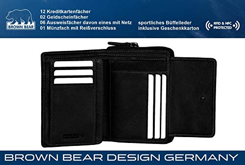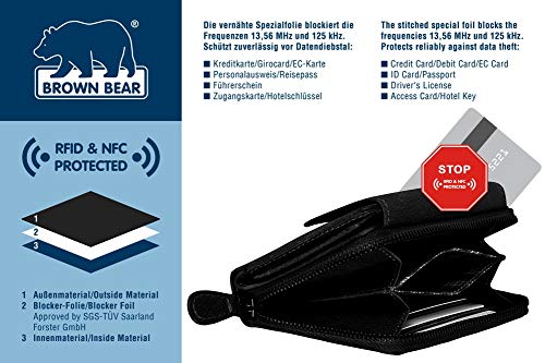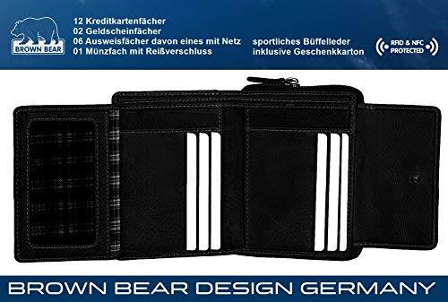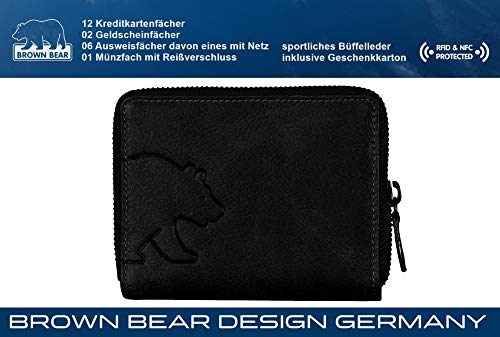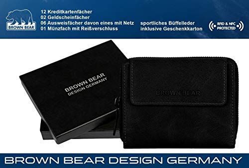 Hochwertiges Design Damen Leder Portemonnaie mit Rfid Schutz Laschenbörse echtes Büffelleder Farbe Schwarz Vintage 12 Kreditkartenfächer 01 Münzfach mit umlaufenden Reißverschluss 02 Euro Geldscheinfächer 06 Steckfächer Ausweisfächer für Fahrzeugschein Personalausweis 01 Überschlag mit Druckknopf Maß geschlossen ca. 13 x 10 x 3 cm (B x H x T) inklusive Brown Bear Design Germany Geschenk Karton unverbindliche Preisempfehlung des Herstellers: Euro 54,95 je Stück Das vernähte und vom SGS TÜV Forster GmbH geprüfte Abschirmfutter schützt vor kommerziell genutzten RFID und NFC Frequenzen: 125 kHz mit einer Schirmdämpfung von 38,7 dB 13,56 MHz mit einer Schirmdämpfung von 45,3 dB