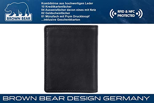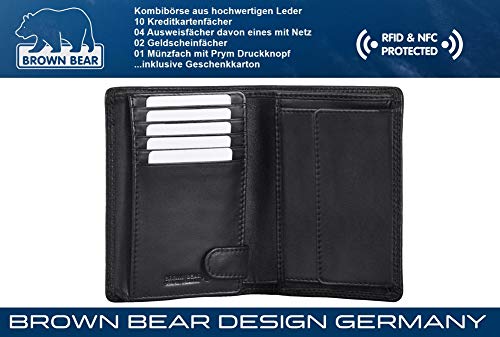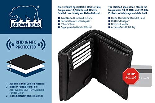 Hochwertiger Geldbeutel Hochformat mit Doppelnaht mit RFID Schutz …für Herren und Damen Echtes Nappaleder Farbe Schwarz 10 Kreditkartenfächer 04 Steckfächer für Ausweise oder Fahrzeugschein 02 Euro Geldscheinfächer 01 Druckknopf Münzfach 01 Klappe links mit Riegel Produktmaß geschlossen ca. 10 x 12,5 x 2,0 cm (B x H x T) inklusive Geschenk Karton Brown Bear Design Germany unverbindliche Preisempfehlung des Herstellers: Euro 59,95 je Stück Das vernähte und vom SGS TÜV Forster GmbH geprüfte Abschirmfutter schützt vor kommerziell genutzten RFID und NFC Frequenzen: 125 kHz mit einer Schirmdämpfung von 38,7 dB 13,56 MHz mit einer Schirmdämpfung von 45,3 dB