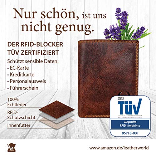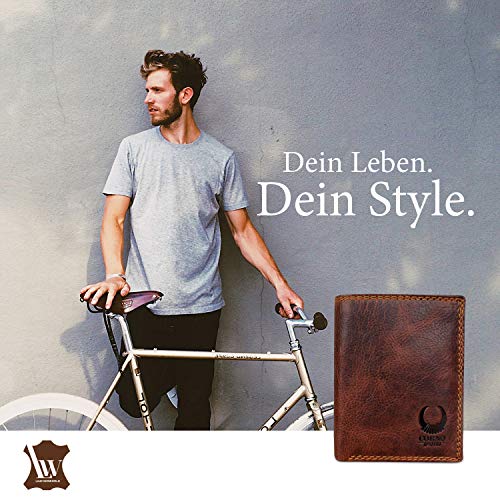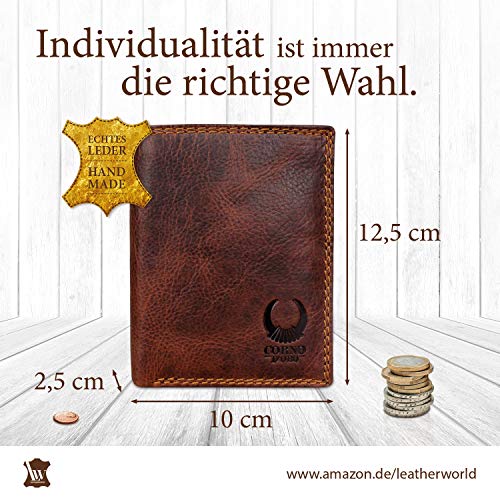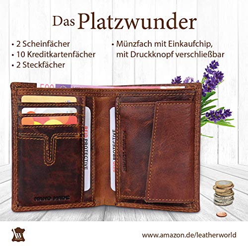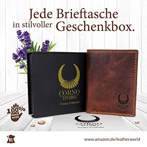Corno d'Oro Herren Geldbörse aus naturbelassenem RindslederDie elegante Herren Ledergeldbörse aus naturbelassenem Rindsleder wurde auf pflanzlicher Basis gegerbt – robustes Leder in bester Qualität. Unsere Geldbörsen werden ausschließlich in Handarbeit gefertigt – so entsteht mit jedem Geldbeutel ein Unikat, das Ihnen einen stilvollen Auftritt garantiert. Das hochwertige Portemonnaie ist Ihr treuer Begleiter durch den Alltag – auf der Arbeit, in der Schule / Uni, beim Einkaufen oder auch beim Sport.Die Fächeraufteilung ermöglicht Ihnen eine optimale Sortierung und einen schnellen Zugriff auf Ihre Dokumente / Unterlagen. Ausweis, Führerschein, Kreditkarten, Bankkarten, Visitenkarten, Gelscheine, Münzen und kleine Wertgegenstände wie Schmuck können sicher aufbewahrt werden. Der integrierte RFID-Blocker verfügt seit Oktober 2018 über ein TÜV-Zertifikat und schützt Ihre persönlichen Daten zuverlässig vor unbefugtem Zugriff.Fächeraufteilung & Eigenschaften:Integrierter, durch TÜV zertifizierter RFID-BlockerFarbe Braun2 Scheinfächer (auch für 100€ und 500€ Scheine geeignet) aus feinstem Leder10 Kreditkartenfächer2 Steckfächer für Ausweis- / Führerschein 1 Münzfach mit Einkaufchip, mit Druckknopf verschließbarDie Außenmaße betragen 12,5 x 10 x 2,5 cm.Überzeugen Sie sich selbst von Corno d'Oro Lederwaren: hochwertige Lederprodukte, die durch exzellente Qualität und Verarbeitung überzeugen. Sorgfältig ausgewählte Materialien und Verarbeitung sorgen für eine lange Lebensdauer der Produkte. Hinweis: Die Farbe der Geldbörse kann auf Grund der natürlichen Gerbung und Ölung leicht vom aktuellen Foto abweichen.