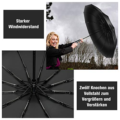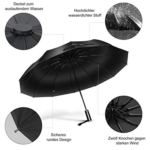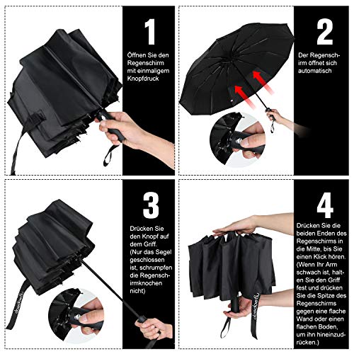 Design mit 12 Rippen: Der Regenschirm ist mit 12 rostfreien Rippen neu entworfen, die starken Winden standhalten und sich nicht leicht biegen lassen. Vollautomatischer Knopf: Einfaches Ein-/Ausschalten mit einer Hand, ideal für verschiedene Szenen. Doppelzweck von Sonnenschutz und Regenschutz: Der Taschenschirm besteht aus 210T Nylon und hochdichtem Vinyl, um ihn mit Regen- und Sonnenschutz zu kombinieren. Lieferumfang: 1 x Regenschirm 1 x Stoffhülle 1 X Schutzhülle aus Kunstleder Sicherheitsgarantie: Wir haben strenge Anforderungen an die Produktqualität und damit glauben, dass Ihnen der 12-Rippen-Regenschirm mit den hochwertigen Materialien und dem einzigartige Design ein gutes Erlebnis bring en werden. Wenn Sie aus irgendeinem Grund nicht zufrieden sind, setzen Sie sich mit uns in Verbindung, wir werden Ihnen jederzeit hochwertigen Service bieten. Achtung: Wenn Ihr Arm beim Zusammenklappen des Regenschirms schwach ist, halten Sie den Griff fest und drücken seine Spitze auf eine flache Wand oder einen flachen Boden, um ihn hineinzuschieben.