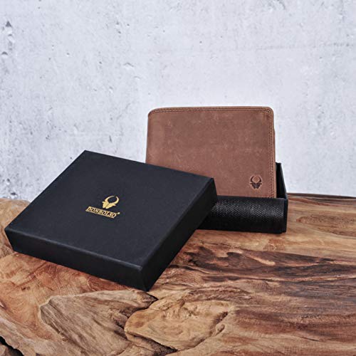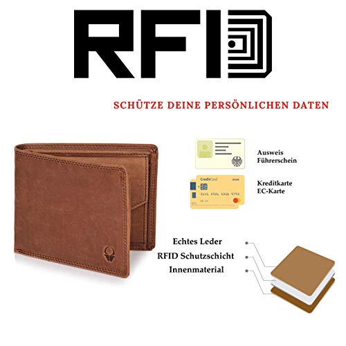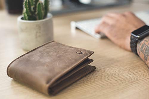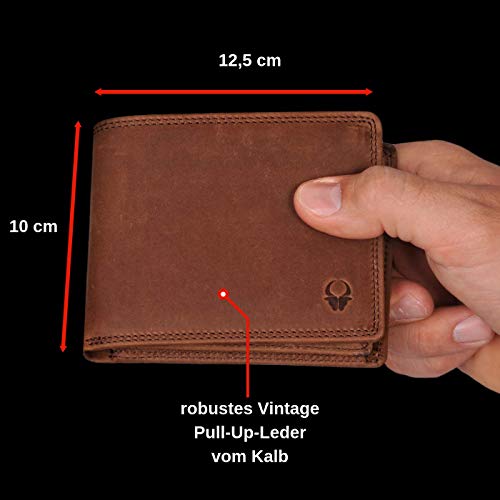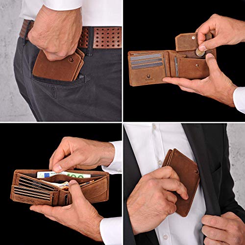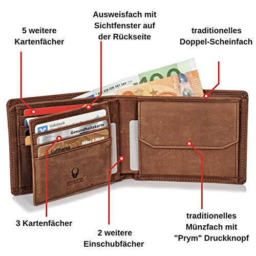 Du liebst es klassisch edel und mit Sichtfach? Dein alter Führerschein soll ebenfalls ins Lederportemonnaie passen? Normale Wallets sind dir zu klein? Hole Dir jetzt die braune DONBOLSO Kartenbörse Zürich und erlebe unsere Premium-Qualität! Die DONBOLSO Herrenportemonnaies überzeugen mit brauner Außenhaut und inneren Werten im Brown-Look. Die hochwertige Herrenbörse bietet auf der linken Seite 5 Fächer. Drei davon sind als Kartenfach ausgeführt, damit man jede wichtige Karte sofort griffbereit hat. Idealerweise verwendet man diese für Kreditkarte oder Scheckkarte. Klappt man das schmale Kreditkartenetui zur Seite, erhält man Zugriff auf 6 weitere Holder und ein großes Ausweisfach, in das sogar ein alter Führerschein passt. Auf der rechten Seite finden Münzen in einer Geldtasche ihren Platz. Viel Platz bietet das Doppelscheinfach, damit dein Geld stets gut geschützt ist. Vergiss alte Brieftaschen oder übergroße Geldtaschen. Mit dem Herrengeldbeutel von DONBOLSO hast du auf kompaktem Raum alles Nötige dabei!Pull-Up-Leder ist ein außerordentlich weiches Rindnubuk-Leder. Typischerweise entstehen durch die Lederverwendung (Abschürfen, Dehnen, Knicken usw.) sichtbare Gebrauchsspuren bzw. Patina. Dieser Ledereffekt ist gewollt und verleiht jedem Exemplar einen individuellen Charakter. Die Vorteile unseres Portemonnaies sind: – feinstes Leder aus europäischer Herkunft – extra dicke Nähte – ausreichend Platz – hochwertige Geschenkbox Deshalb sind diese Etuis ein wunderbares Geschenk. Luxuriöses Design kombiniert mit hervorragender Funktionalität. Fühle den Unterschied! Bestelle jetzt unsere Geldboerse und hole Dir ein Stück Natur nach Hause!