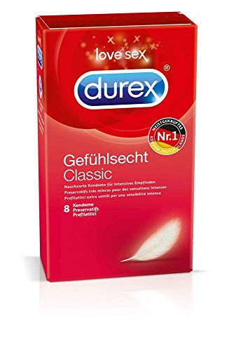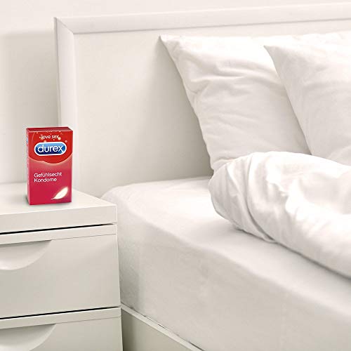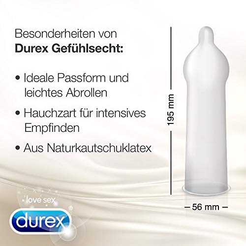 Ihre ideale Passform sorgt für besseren Sitz und ein noch intensiveres Empfinden.Produkteigenschaften:Hauchzarte Kondome aus NaturkautschuklatexIdeale Passform für einen komfortablen Sitz. Mit Reservoir.Transparent und befeuchtetNominale Breite: 56 mm, Länge: 195 mmDermatologisch getestet und 100% elektronisch geprüftDurex Gefühlsecht Kondome sind hauchzarte Kondome, die dünner als herkömmliche Durex Latexkondome sind. Ihre ideale Passform sorgt für einen komfortablen Sitz und ein noch intensiveres Empfinden. Gleichzeitig bieten sie sicheren und zuverlässigen Schutz. Durex Gefühlsecht Kondome sollte jeder probieren, der ein hauchzartes Kondom für intensivere Momente zu zweit sucht. Das spezielle Herstellungsverfahren verleiht Durex Kondomen einen angenehmen Geruch. So lenkt nichts vom Liebesspiel ab. Alle Durex Kondome können zusammen mit Durex Gleitgelen verwendet werden – das Gel wird einfach außen auf das bereits angelegte Kondom aufgetragen.Über Durex:Durex ist die weltweit führende Kondommarke -Durex hat über 80 Jahre Fachkompetenz in Sachen Liebe & sexuellem Wohlbefinden undist mehr als eine reine Kondommarke. Neben verschiedenen Kondomen bietet Durex unter der Marke Durex Play Gleitgele sowie Vibratorenan. Das breite Produktsortiment soll die Menschen inspirieren und ihnen die Möglichkeit bieten, jedes sexuelle Erlebnis genausozu gestalten, wie sie es mögen.Warnhinweise:Bitte lesen Sie den Beipackzettel dieser Packung sorgfältig durch, besonders dann, wenn Sie die Kondome für Anal-oder Oralsex verwenden. Es gibt keine Verhütungsmethode, die einen 100%igen Schutz vor Schwangerschaft, HIV, oder anderen sexuell übertragbaren Krankheiten bietet.Lagerungshinweise:Kühl und trocken aufbewahren und vor direkter Sonneneinstrahlung schützen.Anwendungshinweise: