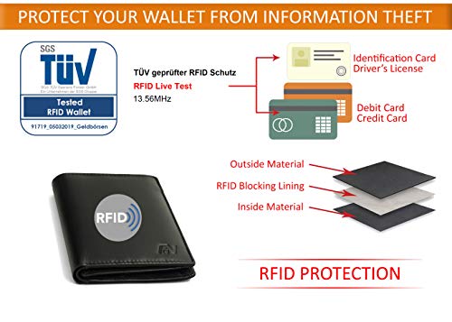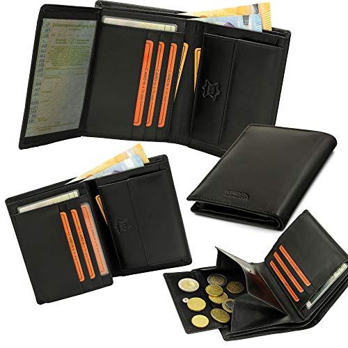 Fa.Volmer schwarze Herren-Ledergeldbörse aus echtem Leder mit RFID-Schutz in Hochformat #VO18 100% ECHT LEDER: Es wurde ausschließlich nur echtes Rind-Leder verwendet. Dieses Rind-Nappa-Leder ist schön weich wirkt edel und ist sehr unempfindlich gegen schmutz, verkratzen und verschleiß. VIEL RAUM: Die extra geräumige Geldbörse bietet 11 Fächer für Kreditkarten, Führerschein, Ausweise und sonstige Papiere. Auch ein Fahrzeugschein passt locker ohne zu knicken hinein. Die Maße sind 13,5 x 10,4 x 2,0 cm. Inklusive großes Münzfach. Fächer auch doppelt belegbar! RFID-SCHUTZ: In der Rückwand der Geldbörse ist eine spezielle Folie eingearbeitet die die Börse in geschlossenem Zustand zuverlässig vor Datenraub und ungewünschtes auslesen persönlicher und sensibler Daten schützt. Die Schutzfolie ist hochqualitativ und neuster Technik. Sie schirmt effektiv einen besonders hohen Frequenzbereich von 125kHz bis 900MHz ab. QUALITÄT: Hohe Qualität Standards, Ständige Qualitätskontrollen, Leder-Prüfungen durch externe Gutachter, und mehr als 15 Jahre Erfahrung mit verschiedensten Herstellern Weltweit haben uns zu Profis gemacht. Wir nehmen Inhalt: 1 X Ledergeldbörse Achtung: Die Geldscheine in den Abbildungen dienen nur zur dekorationszwecken und werden nicht mitgeliefert!!! Markenware von Fa.Volmer