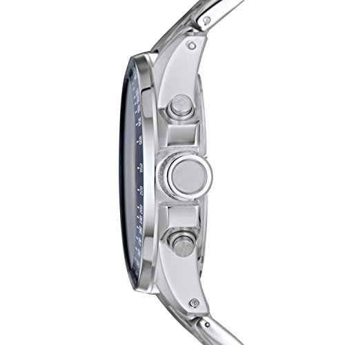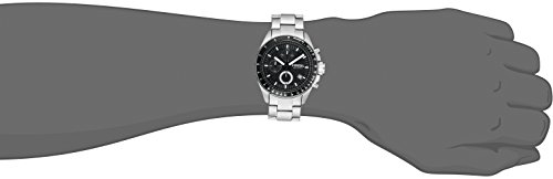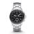 Edelstahl-Gehäuse, verschraubter Boden, Tachymeter-Skala, Krone mit Flankenschutz, Mineralglas, wasserdicht geprüft bis 10 bar, teilpoliertes Edelstahlband, mattierte Faltschließe mit seitlichem Drücker, präzises Quarzwerk, Datumsanzeige, Stoppfunktion 1/10 Sekunde bis 60 Minuten, schwarzes Zifferblatt, weiße Zeiger und Indizes, Leuchtzeiger und Leuchtindizes, Sekundenzeiger, in Fossil Sammlerdose