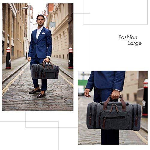 Modische Elemente und Noblen Look Die Tasche kann an den beiden schmalen Seiten nochmals um ca. 5-6 cm erweitert werden. Diese Erweiterung ist mit einem Reissverschluß geschlossen. Das heißt: Tasche erlaubt es einen, die nötigsten Sachen ins Handgepäck zu nehmen oder sie bietet sich für einen Wochenend-/Städtetrip an. Schöne Reisetasche mit viel Platz Diese Tasche ist ausgestattet mit einem großen Hauptfach, zwei Reißverschlusstaschen an den kurzen Außenseiten und 2 Reißverschlussfach an der Längsseite. Die Stollen an der Unterseite verhindern Verschmutzungen beim Abstellen der Tasche. Beschreibung: Außenmaterial: Feiner Canvas Duffel Sporttasche Innenmaterial: Baumwollfutter Art: Softback, 100% neue Marke. Leicht kombinierbarer Freizeit-Reisetasche. Farbe: Schwarz Maße: 20.9 * 9.84 * 11.8 IN / 53 * 25 * 30 CM (L * W * H) Passend für A4 Formate, 13-14'' Laptops, Regenschirme, Portemonnaies ,Bücher, Brillen, Taschentücher und vieles mehr. Verwendung: perfekt für Camping & Wandern & Reisen & die Schule Passend für: Herren / Damen / Unisex Erwachsene / Jungen und Mädchen / Studenten etc. = MATERIAL und VERARBEITUNG = – Die Tasche besteht aus einem stabilen, dichtgewebten Stoff („Canvas“) – Die Reissverschlüsse sind groß und der Zipper besteht aus Metall. Das passt optisch sehr gut zum robusten Material. – Tragegurt, Schulterriemen und die „Griffbänder“ an den Reissverschlüssen sind aus starkem, braunem und recht breitem Webband hergestellt. Der Schulterriemen ist abnehmbar, das darauf befindliche Schulterpolster kann verschoben werden. Das Paket umfasst: 1 x Reisetasche mit Schultergurt