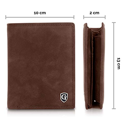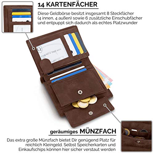 GenTo Design Germany® Sie sind auf der Suche nach einer hochwertigen Männer Geldbörse, die auch noch Ihre Daten schützt? Dieses Herrenportemonnaie verbindet zeitlos edles Design mit bester Qualität und schützt auch noch Ihre Daten. Die Auswahl bester Materialien und die sorgfältige Verarbeitung sorgen für eine lange Lebensdauer. RFID- und NFC-Funkchips sind mittlerweile in jeder neuen gängigen Geldkarte verbaut. Diebe haben somit leichtes Spiel um an Ihre Daten zu kommen, da die Karten diese ständig, unverschlüsselt und für jeden zugänglich an die Umgebung senden. Plastikschutzhüllen, die z.B. auch von Ihrer Hausbank ausgegeben werden, schützen Sie dagegen nicht. Das Portemonnaie bietet Ihnen: Platz für bis zu 15 Kreditkarten RFID- und NFC-Schutz für alle 15 Kartenfächer Ein großes Münzfach Ein Ausweisfach mit Sichtfenster Eingestanztes Logo edles Design Geschenkbox Maße des Portemonnaies: 12,6 x 9,4 x 2cm Gewicht ohne Verpackung: 109g Gewicht mit Verpackung: 159g Gönnen Sie sich diese Freude für einen eleganten Auftritt! Geldbeutel im Hochformat Platz für den Fahrzeugschein Männer Perfektes Geschenk für Männer