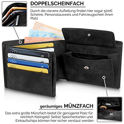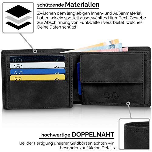 GenTo Design Germany® Sie sind auf der Suche nach einer hochwertigen Männer Geldbörse, die auch noch Ihre Daten schützt? Dieses Herrenportemonnaie verbindet zeitlos edles Design mit bester Qualität und schützt auch noch Ihre Daten. Die Auswahl bester Materialien und die sorgfältige Verarbeitung sorgen für eine lange Lebensdauer. RFID- und NFC-Funkchips sind mittlerweile in jeder neuen gängigen Geldkarte verbaut. Diebe haben somit leichtes Spiel um an Ihre Daten zu kommen, da die Karten diese ständig, unverschlüsselt und für jeden zugänglich an die Umgebung senden. Plastikschutzhüllen, die z.B. auch von Ihrer Hausbank ausgegeben werden, schützen Sie dagegen nicht. Das Portemonnaie bietet Ihnen: Platz für bis zu 15 Kreditkarten RFID- und NFC-Schutz für alle 15 Kartenfächer Ein großes Münzfach Ein Ausweisfach mit Sichtfenster Eingestanztes Logo edles Design Geschenkbox Maße des Portemonnaies: 12,6 x 9,4 x 2cm Gewicht ohne Verpackung: 109g Gewicht mit Verpackung: 159g Gönnen Sie sich diese Freude für einen eleganten Auftritt! Geldbeutel im Hochformat Platz für den Fahrzeugschein Männer Perfektes Geschenk für Männer