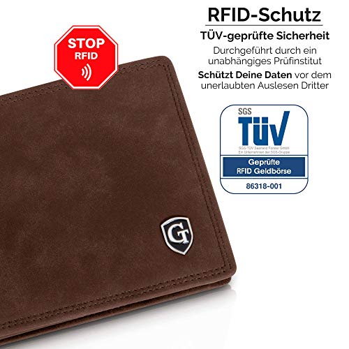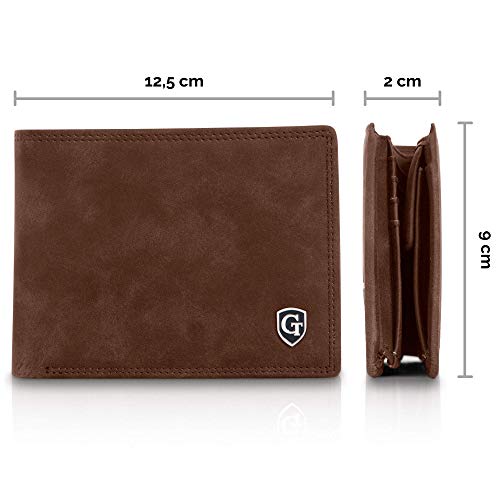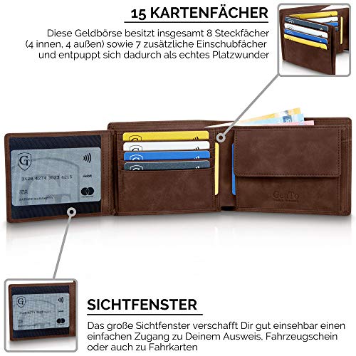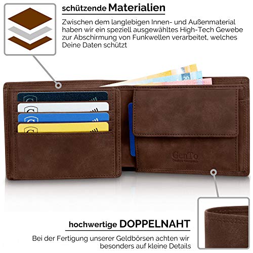 GenTo Design Germany® Sie sind auf der Suche nach einer hochwertigen Männer Geldbörse, die auch noch Ihre Daten schützt? Dieses Herrenportemonnaie verbindet zeitlos edles Design mit bester Qualität und schützt auch noch Ihre Daten. Die Auswahl bester Materialien und die sorgfältige Verarbeitung sorgen für eine lange Lebensdauer. RFID- und NFC-Funkchips sind mittlerweile in jeder neuen gängigen Geldkarte verbaut. Diebe haben somit leichtes Spiel um an Ihre Daten zu kommen, da die Karten diese ständig, unverschlüsselt und für jeden zugänglich an die Umgebung senden. Plastikschutzhüllen, die z.B. auch von Ihrer Hausbank ausgegeben werden, schützen Sie dagegen nicht. Das Portemonnaie bietet Ihnen: Platz für bis zu 15 Kreditkarten RFID- und NFC-Schutz für alle 15 Kartenfächer Ein großes Münzfach Ein Ausweisfach mit Sichtfenster Eingestanztes Logo edles Design Geschenkbox Maße des Portemonnaies: 12,6 x 9,4 x 2cm Gewicht ohne Verpackung: 109g Gewicht mit Verpackung: 159g Gönnen Sie sich diese Freude für einen eleganten Auftritt! Geldbeutel im Hochformat Platz für den Fahrzeugschein Männer Perfektes Geschenk für Männer