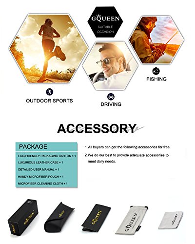 GQUEEN fokussiert sich auf eine Reihe an funktionellen Brillen, von Blaulicht-filternden Computerbrillen, ¨¹ber UV400 sch¨¹tzende, polarisierte Brillen und andere modische Brillen. Wir bem¨¹hen uns unseren Kunden stets hochwertige Produkte zu einem guten Preis anzubieten Polarisierung Polarisierte Sonnenbrillen besitzen einen Filter, der den Glanz durch Reflektionen auf flachen Oberfl?chen (Wasser, Schnee, Stra?en) verhindert, sodass die Sicht nicht beeintr?chtigt wird. Sie k?nnen sich Sport, w?hrend dem Fahren und dem Angeln als sehr n¨¹tzlich erweisen, indem die Teilnehmer dieser Aktivit?ten besser sehen k?nnen. Die Vorteile durch das Tragen einer polarisierten Sonnenbrille wurden durch die allgemeine ?ffentlichkeit erkannt. Sie bieten einen Premiumschutz gegen die sch?dlichen Sonnenstrahlen. UV400 UV400 Schutzgl?ser blockieren 100% der UVB und UVA Strahlen. UV 400 indiziert einen Augenschutz, der die Aussetzung von UVA und UVB Strahlungen vermeidet. UV 400 gesch¨¹tzte Gegenst?nde k?nnen Lichtstrahlen von bis zu 400 Nanometer blockieren. Inhalt Brille X1, Verpackungsbox X1, Mikrofaser Reinigungstuch X1, Mikrofaser Beutel X1. Zufriedenheitsgarantie Alle GQUEEN Sonnenbrillen umfassen eine 30 Tage Geld-zur¨¹ck-Garantie. Sollten Sie mit Ihrem Kauf also nicht komplett zufrieden sein, so z?gern Sie bitte nicht uns zu kontaktieren, sodass wir uns darum k¨¹mmern k?nnen. Sie tragen kein Risiko und wir bieten Ihnen den besten Service!