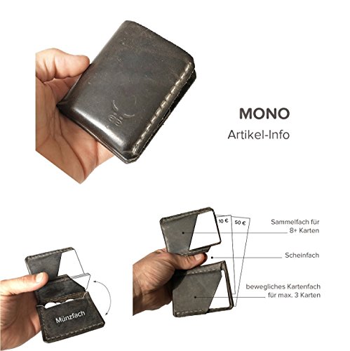 MONO ist mini. Und eigentlich für Männer. Nur 1 LEDERFLÄCHE wird hier gefaltet und durch 6 HANDNÄHTE entsteht ein maximal reduzierter Geldbeutel von BESTEr QUALITÄT. Gefertigt wird er von Magda und Theresa in unserer kleinen Werkstatt im Allgäu (Füssen). Sie vernähen hier von Hand mit gewachstem Forellengarn ein ca 1,2 mm starkes Rindsfettleder mit sog. Pull-up-Effekt – ein Leder, das im Gebrauch erst richtig schön wird. An Stellen hoher Reibung (hier die Außenfläche) tritt das Lederfett nach außen und bildet diese einzigartige Patina, die Lederprodukte oft so dauerhaft wertvoll werden läßt. Unser Geldbeutel MONO ist klar durchdacht & unkaputtbar. Er ist völlig metallfrei, maximal Material-reduziert… und garantiert so eine dauerhafte Nutzbarkeit. Druckknöpfe, Reißverschlüsse o.ä. sind „Verschleißteile“. Sie nehmen zuerst Schaden und schränken dann schnell die Nutzbarkeit ein – beim MONO ist das Münzfach allein durch das bewegliche Karten-Mittelfach ganz sicher verschließbar, ohne daß etwas verloren gehen kann. Das Scheinfach ist ebefalls sehr komfortabel. Es ist trotz der Kompaktheit des Artikels nicht nur genügend groß für 100€-Scheine, sein offener Eingriff macht es zudem einsehbar und hilft so hervorragend bei der Organisation einer überschaubaren Ordnung. Sie sehen hier auch einen Prototypen im Gebrauch… in diesen Farben ist er aktuell unser Topseller. MONO hat Platz für alles Nötige: 10+ Karten, Kleingeld und ein leicht zugängliches & übersichtliches Steckfach für Scheine, auch große.