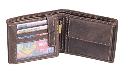 Scheintasche LEAS in Echt-Leder, dunkelbraun 8205-12-02 Hersteller: LEAS Farbe: Dunkelbraun Diese Börse aus Leder erfüllt alle Erwartungen, die man in Bezug auf einen Geldbeutel aus naturbelassenem Leder haben kann. Das antikbraune Portemonnaie im angesagten Vintage-Look überzeugt durch sein praktisches Querformat. Neben 4 Kreditkartenfächer im Linksausleger mit Innenriegel und 3 Kreditkartenfächern hinter der Klappe, lassen sich auch bis zu 2 Ausweise (durch Einsteckfächer rechts und links vom Reißverschluss auf 4 erweiterbar)in die Börse integrieren. Mit den äußeren Maßen von ca. 12,5 x 9,5 cm lässt sich der Geldbeutel bequem in der Jacken- oder Hosentasche verstauen. Material: Eine Volllederbörse aus weichem, geöltem Rindleder. Jeder Artikel der naturbelassenen TORO-Serie ist ein Unikat! – So entwickelt im Laufe des Gebrauchs jeder Artikel seine eigene Leder- und Farbnuancen. Dieser Vorgang betont die natürliche Struktur der Produkte und verleiht jeder einzelnen Börse ihren individuellen Charakter – Lederkenner schätzen den Look des getragenen Leders als „Gewisses Etwas“. Eigenschaften: – 8 Kreditkartenfächer – 1 Kreditkartensichtfach – 2 Ausweissichtfächer – 2 Scheinfächer – 2 Einsteckfächer rechts und links vom Reißverschluss – 1 Mittelreißverschluss – komplette Vollederausstattung – alle Kartenfächer eingenäht – Einkaufschipfach im Kleingeldfach – Innenriegel Maße: Breite 12,5 cm Höhe 9,5 cm