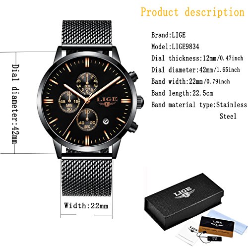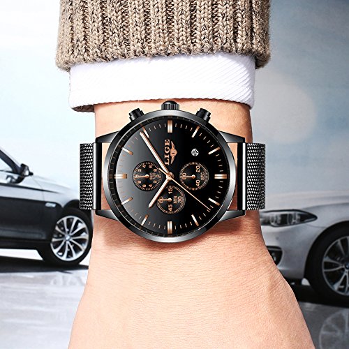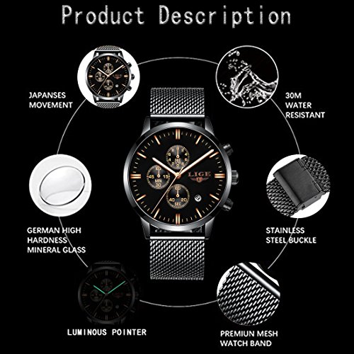 Eigenschaften: 1. importierte Japan Quarzwerk und Batterie: bieten genaue Zeit zu halten, wird die Uhr für mehr als 3 Jahre dienen 2.High Härte Mineralglas Zifferblatt: stoßfest und Schlüssel kratzfest 3.Comfortable zu tragen: passendes Uhrgewicht, hochwertiges Ineinandergreifen-Edelstahluhrband und glatte Ineinander greifenstahlbandoberfläche, alle diese lassen diese Uhr super bequem zu tragen4.Einfaches und elegantes Design: Einfaches und luxuriöses schwarzes Zifferblatt mit Kalender, 30M wasserdicht perfekt für den täglichen Gebrauch Material: Gehäusematerial: Edelstahl Band-Material: Sainless Stahl Zifferblatt: Mineralglas mit hoher Härte (kratzfest) Spezifikation: Zifferblattfarbe: Schwarz Zifferblatt Gehäusedurchmesser: 1,6 7Zoll / 42mm Zifferblatt Gehäusedicke: 0,4 7Zoll / 12 mm Bandfarbe: Schwarz Bandbreite: 0,8 Zoll / 20 mm Uhr Gewicht: 3.88 oz /110 g Was ist in dem Paket: 1 * Herren Mesh Edelstahl Armbanduhr 1 * Quarzuhr Englisch Anleitung 1 * Uhr Link Remover 1 * Luxuriöse Leder-Uhrenbox aus Papier 1 * hochwertige Mikrofaser Reinigungstuch **HINWEIS**: 1. Reinigen Sie den Gurt und das Gesicht mit dem Mikrofaser-Reinigungstuch regelmäßig zur Verfügung gestellt wird dringend empfohlen 2. Zu viel Wasserkontakt verkürzt das Leben der Uhr