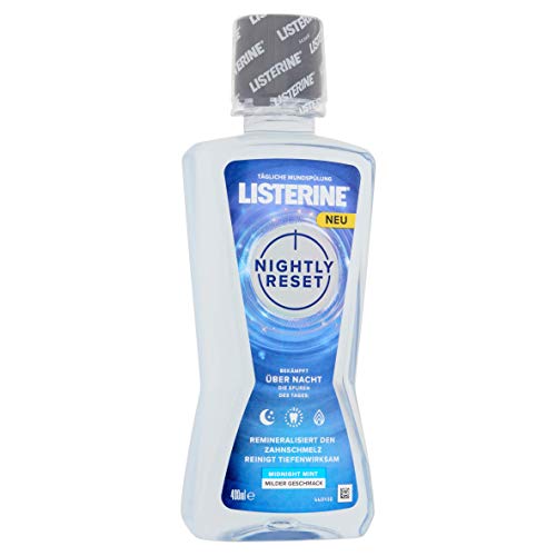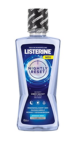 Nightly Reset, 400 ml Die Listerine Mundspülung Nightly Reset mit mildem Geschmack bekämpft über Nacht die Spuren des Tages. Sie reduziert die Säurebildung und die Rapid-Fusion-Technologie remineralisiert den Zahnschmelz, für eine effektivere Fluoridaufnahme und stärkere Zähne. Sie reinigt tiefenwirksam, indem sie Stellen erreicht, an die die Zahnbürste nicht kommt. Dabei reduziert sie die Neubildung von Zahnbelag, bekämpft Bakterien und erfrischt den Atem langanhaltend. – Mit Rapid-Fusion-Technologie – Mit Fluorid zur Stärkung der Zähne – Mit ätherischen Ölen – Wirkt antibakteriell – Die Mundflora bleibt im Gleichgewicht