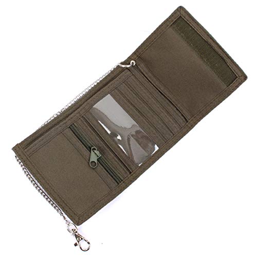 600 x 600D Polyester, Polyvinylchlorid beschichtetKette: MetallGröße: 9 x 13 cm- Kette mit Karabinerhaken zur Befestigung- Geldscheinfach- Münzfach mit Reißverschluss- 4 Fächer für Kreditkarten, Dokumente, Ausweise usw.