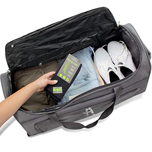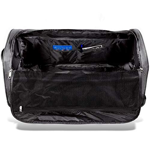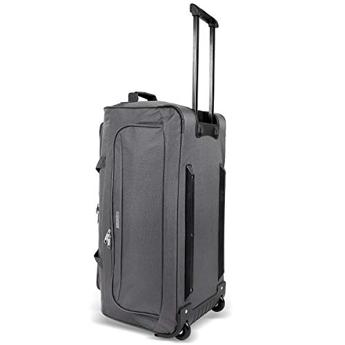 Geräumige noorsk Reisetasche Sporttasche in verschiedenen FarbenDurch ihr ideales Volumen von ca. 90 Litern ist die robuste Reisetasche auf Rollen mit versenkbarem Trolleygriff und Handgriff im oberen Bereich einfach bestens für lange Reisen, für Wochenendtrips als Weekender und als Sporttasche zum Training etc. geeignet. Die stabilen Griffe mit Klettfixierung bieten einen hohen Tragekomfort wenn Sie die große Tasche als Tragetasche oder Schultertasche nutzen möchten. Aber dank des versenkbaren Trolleygriffes und der 2 leichtlaufenden Rollen kann die XL Duffle Bag wenn gewünscht auch optimal und lässig als Trolley gezogen werden. So haben Sie durch die integrierte Trolleyfunktion auch die Möglichkeit weitaus bequemer unterwegs zu sein, als mit herkömmlichem Weichgepäck. Ausgestattet mit 2 Verstärkungsstreben aus stabilem Kunststoff wird die Travel Bag zusätzlich stabilisiert. Neben dem sehr geräumigen Hauptfach des Rollkoffers mit 2-Wege Reißverschluss, in das alle nötigen Dinge für Ihre Reise optimal hineinpassen, ist noch eine praktische Außentasche mit Reißverschluss vorhanden. Dort ist Platz für Dokumente und kleines Reisezubehör, um sofort darauf zugreifen zu können. Die perfekte Reisebegleitung!Details:· Reisetasche mit Trolleyfunktion· versenkbarer Trolleygriff· seitlicher stabiler Tragegriff/Schultergurt mit Klettfixierung· Handgriff oben· geräumiges Hauptfach mit 2-Wege Reißverschluss· praktische Außentasche mit Reißverschluss· 2 leichtlaufende Rollen· 2 Verstärkungsstreben· ca. 90 Liter Volumen· Maße: ca. 70 x 34 x 37 cm· Gewicht: ca. 2,4 kg· Material: 100% PolyesterFarben:· Schwarz· Grau· Blau