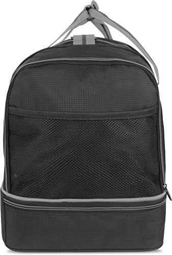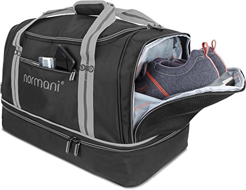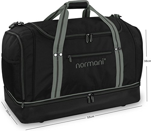 Die Sporttasche von normani in drei Größen ist für Kurzreisen genauso geeignet wie für den Sport im Studio und den Besuch im Schwimmbad. Die Tasche hat eine verstärkte Bodenpartie mit fünf robusten Abstandshaltern, die die Unterseite vor Feuchtigkeit und Verschmutzungen schützen. Der untere Teil der Tasche kann mit einem Reißverschluss aufgeklappt werden, um hier Schmutzwäsche, oder nasse Badekleidung unterzubringen, ohne, dass der Rest des Inhalts nass wird. (Bei den Größen 58 und 28 Liter gibt es zusätzlich einen Reißverschluss zum Hauptfach der Tasche.)Die hoch funktionale Tasche hat ein extra Schuhfach auf der rechten und ein weiteres Fach auf der linken Seite, für Kleinigkeiten wie Portemonnaie, Schlüssel oder die Mitgliedskarte. Zusätzlich befindet sich rechts ein flexibles Mesh, um Dinge zu verstauen, die schnell griffbereit sein sollen. Auf der Front der Tasche gibt es die Möglichkeit das Smartphone in der Reißverschlusstasche unterzubringen. Die Tasche von normani ist also ein Allroundtalent, dass mit Funktionalität, sowie schlichten, sportlichen Design punktet.Details: Geräumiges Hauptfach mit Zwei-Wege-Reißverschluss Seitliches Schuhfach Bodenfach mit Zwei-Wege-Reißverschluss für Wäsche/nasse Sportkleidung Bodenabstandshalter für optimalen Schutz Verstellbarer und abnehmbarer Schultergurt mit Polster Zwei zusammen fassbare Griffe mit Polster Tolle, strahlende FarbenMaße: 90 Liter: 62 x 34 x 40 cm 58 Liter: 55 x 30 x 36 cm 28 Liter: 49 x 23 x 24 cmGewicht: 90 Liter: 1384 g 58 Liter: 1074 g 28 Liter: 787 g