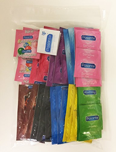 Sie müssen den Super Mix von Pasante unbedingt haben, wenn Sie viele unterschiedliche Kondome ausprobieren möchten. Der Mix enthält die folgenden Kondome: 5 x Pasante Regular Die Pasante Regular Kondome bieten einen bequemen Komfort. Sie sind befeuchtet und spermizidfrei. 5 x Pasante Infinity Delay Dank des speziellen Gleitfilms (Lidocaine 1%) wird der Höhepunkt verzögert. Ein längeres und schöneres Vergnügen für beide Partner. 5 x Pasante Intensity Die Kondome sind anatomisch geformt. Die dual-profilierte Oberfläche stimiliert beide Partner bis zum Maximum. Die Kondome sind sowohl gerippt als auch genoppt. 5 x Pasante Xtra Sensitive Die Pasante Feel (Sensitive) Kondome sind hauchdünn und übertragen die Körperwärme. 5 x Pasante Extra Safe Die Kondome haben eine etwas höhere Wandstärke und verfügen über zusätzlichen Gleitmittel. So können Sie sich besonders sicher fühlen. 5 x Pasante Naturelle Die Pasante Naturelle Kondome haben eine anatomische Passform und sind an der Eichel etwas weiter als am Schaft. 5 x Pasante Blueberry Blast Der Pasante Blueberry Blast Geschmack Kondom hat eine anatomische Passform. Du wirst feststellen wie erfrischend es sich anfühlt, fast wie ein Blaubeer. 5 x Pasante Strawberry Crush Der Pasante Strawberry Crush Geschmack Kondom hat eine anatomische Passform. Du wirst feststellen wie erfrischend es sich anfühlt, fast wie Erdbeer. 5 x Pasante Ribbed DIe Pasante Ribbed Kondome verfügen über Rippen entlang des Schafts und bieten so ein besonders intensives Erlebnis für beide Partner. 5 x Pasante Cooling Sensation Die Pasante Cooling Sensation Kondome sind gerippt, befeuchtet, mit Reservoir und aus Naturkautschuk-Latex. Der besondere Clou: der kühlende Feuchtigkeitsfilm ist ein prickelndes Erlebnis für beide Partner.