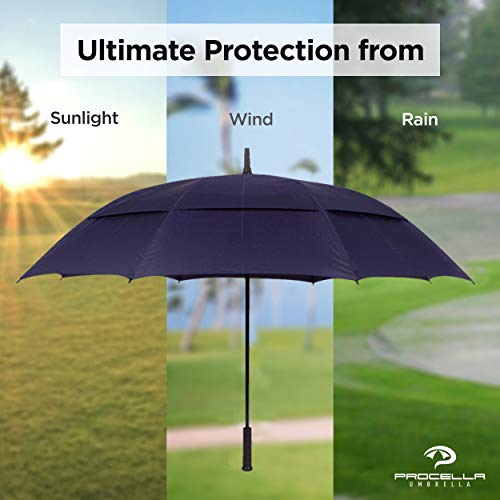 Starker Wind und schlechtes Wetter? Kein Problem für unsere Procella Premium Regenschirme! Andere Produkte enden bei starkem Regen und Wind in einem umgestülpten Regenschirm. Nicht so der Procella Regenschirm! Sein ausgelassenes Design lässt die Luft durch den Schirmstoff dringen und bietet zur gleichen Zeit besten Schutz vor Regen. Die beste kompakte Golf Regenausrüstung. Dank des urheberrechtlich geschützten Netz-Lüftungssystems, des rutschfreien Griffs und Glasfaserrahmens, ist dieser Regenschirm unschlagbar. Mit dem Klettgurt und der Schutzhülle verstauen Sie ihn einfach in Ihrer Golftasche oder Golfwagen. Perfekt für jedes Wetter. Der Procella Regenschirm hilft Ihnen dabei Ihr Golfspiel zu genießen, egal bei welchem Wetter.Setzen Sie Ihn gegen stürmischen Regen ein, als Schattenspender auf einem warmen Strandkurs, oder als Schutz vor der heißen Sonne im Sommer. Die beste Flächendeckung die Sie finden werden. Unser Golf Regenschirm (157cm Bogen-Spannweite, 132cm Breite von Kante zu Kante und 1m Länge) versorgt Sie mit komplettem Regen- und Sonnenschutz, ob auf dem Golfplatz oder bei einem Sportevent im Freien, am Strand oder den Hund Spazieren führen. Zufriedenheitsgarantie. Unser automatisch, einfach zu öffnende Golf Regenschirm mit Glasfaserrahmen und Lüftungsschirm hat eine 100%ige Geld-Zurück-Garantie. Falls Sie mit unseren Produkten nicht zufrieden sein sollten, schicken Sie uns diese für eine Rückerstattung einfach zurück. Copyright Premium Regenschirme von Procella Umbrella. Alle Rechte vorbehalten. 2019 Procella Regenschirm. Alle Rechte vorbehalten.