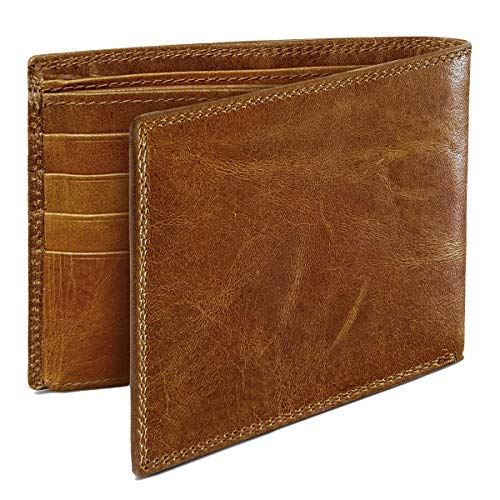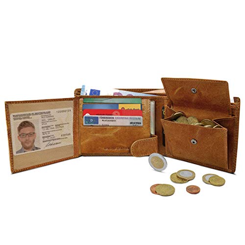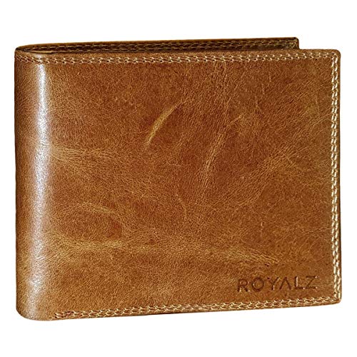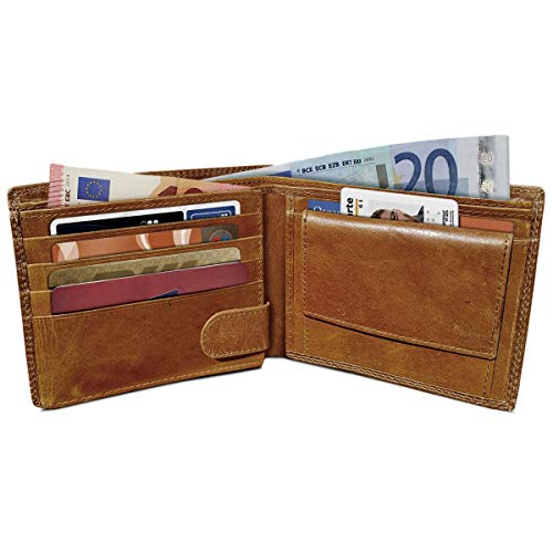 ROYALZ Portemonnaie für Herren | Vintage Geldbörse aus Leder Dezent aus braunem Echtleder, mit ROYALZ Logo für den klassischen Mann: dieses Portmonnaie für Herren bietet ausreichend Platz für alles Nötige wie Geld, EC- und Kreditkarten sowieso Ausweise und Fotos. Im gleichen Augenblick ist die Vintage Geldbörse durch ihr kompaktes Format klein genug, um bequem in jeder Hosentasche Platz zu finden. Aufteilung: 8 x EC Kartenfächer + 1 weiteres Fach mit Netz-Fenster – Scheckkartenformat 2 x Geldscheinfach 3 x Einsteckfach 1 x Fach für Kleingeld mit praktischem Druckknopf Highlights: Dank der natürlichen Lederstruktur ist jedes Portemonnaie ein individuelles Unikat Besonders praktisch ist das Netzfach für Ausweis, Reisepass und sonstige Identifikationskarten – Sie können den Pass schnell und sicher vorzeigen Futter: Polyester Material: echtes, robustes und widerstandsfähiges Leder Maße im geschlossenen Zustand (BxHxT) : ca. 12,5cm x 10 cm x 2 cm Gewicht: 70 Gramm Design: Vintage / Retro Echtes Naturprodukt ! Somit können leichte Farbabweichungen auftreten Dekorationsartikel gehören nicht zum Lieferumfang