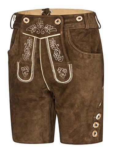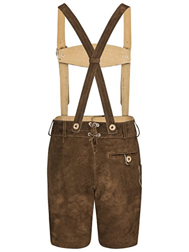 Herren Trachten Lederhose Schöneberger – Oktoberfest Lederhosen kurz Feldberg Das Modell Feldberg von Schöneberger Trachten ist die traditionelle Trachtenlederhose für jeden Anlass und Zeit. Die feinen und detaillierten Stickereien sind am am Hosenlatz, der Messertasche und dem Hosenträger gestickt. Gefertigt ist diese selbstverständlich aus hochwertigem Leder und rustikalen Knöpfen. Der ideale Begleiter für jedes Volksfest, Wanderung oder für die Freizeit. Mittels dem Lederbändchen am Hosenbund, können Sie die Hose individuell auf Ihre Größe abstimmen. Das Modell Feldberg ist ein echter Klassiker mit hohem Tragekomfort. Produkteigenschaften: verfügbare Farben: braun Material: 100% Leder / Innenfutter: 100% Polyester Schnittform: gerader Schnitt Passform/Weite: Schmal Taschen: 2 Taschen vorne | 1 Messertasche an der Seite | 1 knöpfbare Gesäßtasche Hosenträger sind enthalten Passform: Die Hose fällt ein wenig kleiner aus. Bitte beachten Sie, dass diese Trachtenhose aus echtem, natürlichem Leder gefertigt ist, deswegen kann diese beim ersten Tragen ruhig ein wenig enger sitzen. Im Laufe der Zeit weitet sich die Hose noch ein wenig und passt sich Ihrer Körperform an. Größentabelle: Gr. 46: Bundweite: 79-82 cm Gr. 48: Bundweite: 83-86 cm Gr. 50: Bundweite: 87-90 cm Gr. 52: Bundweite: 91-95 cm Gr. 54: Bundweite: 96-100 cm Gr. 56: Bundweite: 101-105 cm Gr. 58: Bundweite: 106-110 cm Gr. 60: Bundweite: 111-115 cm Gr. 62: Bundweite: 116-120 cm Gr. 64: Bundweite: 121-125 cm
