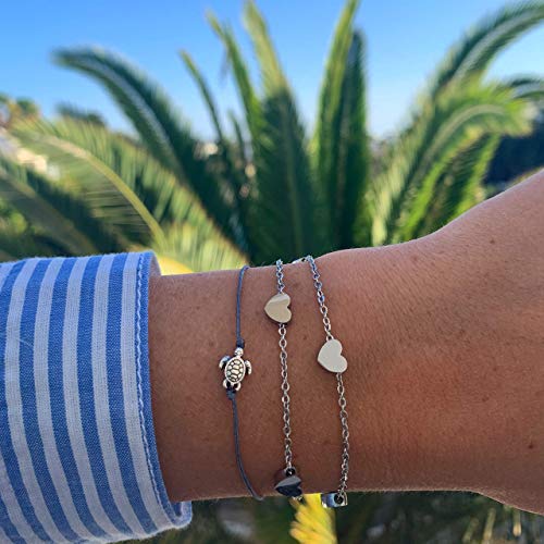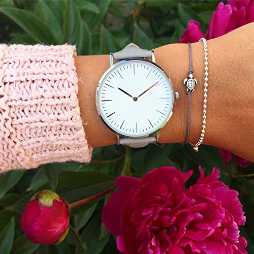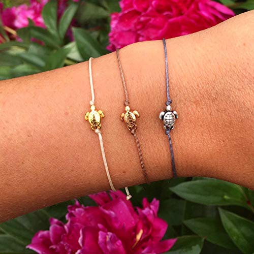 Dieses handgemachte Schildkröten Armband ist ein größenverstellbares Textilarmband. Besonders im Sommer ist dieses hübsche Armbändchen ein echtes Highlight und Hinkucker! Durch Ziehen an den Enden des Textilbands lässt sich das Armband sehr einfach in der Größe verstellen. Somit passt es auch sehr zarten Handgelenken und sieht einfach super aus. Es besteht aus einem grauen Textilband, der kleinen Schildkröte aus DQ Metall (DQ steht für Designer Qualität) und versilberten Perlen an den Enden. Dieses Armband gibt es auch in anderen Farben, mit goldener und roségoldener Schildkröte. Die beiden anderen Farben seht ihr auch auf einem der Bilder. Gerne kann die Farbe des Textilbandes auch geändert werden. Auch Wunsche mache ich es mit schwarzem, weißem, braunem, blauem, pinkem, beigefarbenem, uvm. Band. Schreibt mir hierzu gerne eine Nachricht!