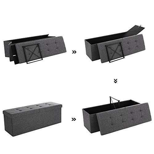 Die Songmics Sitztruhe stellt die perfekte Ergänzung für Ihre Wohnungseinrichtung dar. Durch ihre Konstruktion erfüllt sie gleich mehrere Zwecke auf einmal, vor allem für kleine Wohnungen mit wenig Staumöglichkeit, ist die Sitzbank hervorragend geeignet. Sie ist auch absolut standfest. Auch wenn sich ein großer und schwerer Mensch darauf setzt, hält sie locker Stand. Der Boden sorgt zusätzlich für Feuchtigkeitsschutz. Hinweis: – Kein Spielzeug! Benutzung durch kleine Kinder nur unter unmittelbarer Aufsicht von Erwachsenen. Produktdetails: – Maße (außen): 110 x 38 x 38 cm (B x H x T) – Maße (innen): 107 x 34 x 33,5 cm (B x H x T) – Maße (zusammengefaltet): 110 x 38 x 7 cm – Farbe: Dunkelgrau – Material: Leinen + MDF-Platte + Schaumstoff – Nettogewicht: 8,6 kg – Bruttogewicht: 9,4 kg – Max. Belastbarkeit: 300 kg Lieferumfang: – 1 x Sitztruhe