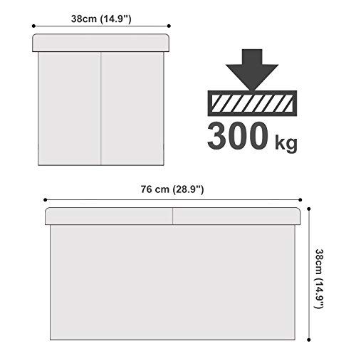 Brauchen Sie immer mehr Stauraum? Verfügen Sie nie über ausreichend Sitzplätze für die Besucher? An der Songmics faltbaren Sitztruhe begeistern Sie sich bestimmt. Sie bietet nicht nur eine Sitzgelegenheit , sondern hat auch einen großen Stauraum für diverse Sachen, wie Zeitschriften, Plüschtiere, DVDs, Kleidungsstücke usw. Außerdem kann man diese Sitztruhe auch als Nachttisch, Fußbank, Schuhbank, Tritthocker usw. benutzen. Dank der Faltbarkeit ist der Artikel bei Nichtgebrauch auch platzsparend zu verstauen. Darüber hinaus ist die Songmics Sitztruhe gut verarbeitet, alle Nähte sind sauber vernäht. Sie ist ein wahres Platzwunder! Produktdetails: – Maße: 76 x 38 x 38 cm (B/H/T) – Maße innen: 73 x 35 x 35 cm (B/H/T) – Material: MDF-Faserplatten nach E1 Standard geprüft + Kunstleder Lieferumfang: – 1 x faltbare Sitztruhe