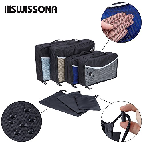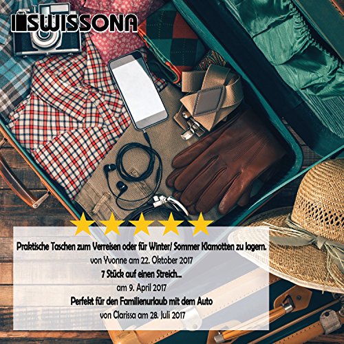 ✯✯ SWISSONA PACKWÜRFEL ✯✯ Mit dem SWISSONA Packwürfel werden Kleidungsstücke und kleine Reiseutensilien schnell und mit System verstaut! ✯✯ HIGHLIGHTS ✯✯ – Hochwertige Materialien: Das verwendete Nylon ist besonders strapazierfähig und von langer Lebensdauer – Zeitsparend: Dank des einfachen und strukturierten Verstauens wird sowohl beim Packen als auch beim Auspacken Zeit gespart – Bessere Gepäckverteilung auf Flugreisen: Dank der Kleidertaschen können nun auch Kleidungsstücke schonend und platzsparend im Handgepäck untergebracht werden – eine bessere Gepäckverteilung spart unnötige Gebühren für Übergewicht am Flughafen – Geringes Gewicht: Aufgrund des geringen Gewichts von insgesamt nur 375 Gramm wird das Gewicht des Reisegepäcks nur minimal erhöht – Lieferumfang & Abmessungen: 2 x große Taschen 40 x 30 x 10 cm, 2 x kleine Taschen 34 x 22 x 10 cm, 3 Wäsche-/Schuhtaschen (24 x 15 cm, 31 x 18 cm, 38 x 24 cm) – 2 Jahre Zufriedenheitsgarantie (Garantiebedingungen: Königstein Direkt gewährt eine freiwillige, EU-weite Garantie von 2 Jahren, beginnend mit Erhalt des Produktes nach Kauf. Die Garantie beinhaltet das Recht zum Austausch bzw. zur Erstattung des Preises. Zur Geltendmachung kontaktieren Sie bitte Königstein Direkt, Weipertstraße 8-10, 74076 Heilbronn. Bestehende gesetzliche Rechte werden durch diese Garantie in keiner Weise eingeschränkt.) ✯✯ AUF GEHT'S – MIT SWISSONA KANN DIE REISE BEGINNEN! ✯✯ SWISSONA Produkte stehen nicht nur für hohe Qualität und eine solide Verarbeitung, sondern auch für Cleverness. Nicht umsonst lautet der Slogan der Marke „Travel smart“. Entscheiden auch Sie sich für sorgenfreies und entspanntes Reisen durch die gute Organisation und das gewisse Etwas mit SWISSONA und die Reise kann beginnen!
