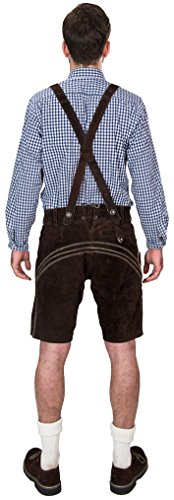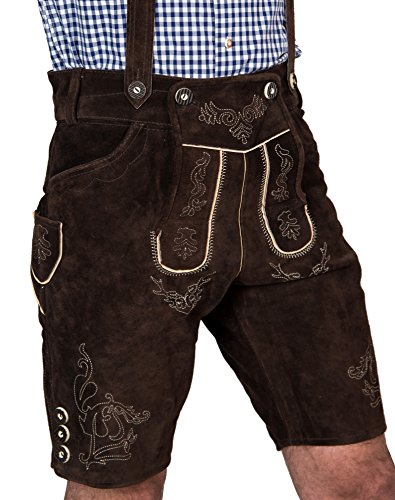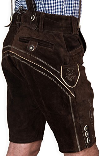Sie erwerben hier eine wunderschöne, handgefertigte kurze Trachtenlederhose aus feinstem Veloursleder in dunkelbraun aus unserem Trachten- und Vereinsbekleidungssortiment. Es handelt sich hierbei um den Klassiker unter den Trachtenlederhosen zum Hammerpreis. Ob Oktoberfest oder festliche Anlässe, sie passt immer. Diese Trachtenlederhose ist mit einer aufwendigen Stickerei verstehen. Die Auslieferung erfolgt inklusive passender Träger, die in der Größe verstellbar sind und die Sie individuell anpassen können. Die Lederhose verfügt über 2 Taschen vorne, eine Gesäßtasche sowie eine seitlich angebrachte Messertasche. Das Leder wird mit einer Einlage verstärkt. Außerdem ist ein Innenfutter aus Polyester eingearbeitet. Mit einer kleinen Schnürung, die durch Ösen verläuft, können Sie den Hosenbund und die Beinweite passend variieren. Die Hose verfügt über Gürtelschlaufen. WICHTIG: Die für Sie richtige Größe ermitteln Sie, indem Sie einfach Ihren Bundumfang in cm ermitteln (siehe Bild). Entsprechend dieser wählen Sie eine der folgenden Größen aus: Größe 44 (<75 cm) Größe 46 (76-81 cm)Größe 48 (82-86 cm)Größe 50 (87-91 cm)Größe 52 (92-96 cm)Größe 54 (97-101 cm)Größe 56 (102-106 cm)Größe 58 (107-111 cm)Größe 60 (112-115 cm)