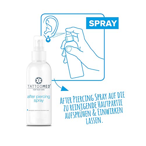 TattooMed After Piercing Spray bietet optimalen hygienischen Schutz und fördert die Abheilung. Es ist ein speziell entwickeltes Pflegeprodukt für die intensive Reinigung gepiercter Haut, sowie des Schmucks.TattooMed After Piercing Spray dringt selbstständig in den Stichkanal ein und reinigt so auch in schwer zugängliche Areale und verhindert Infektionen sowie Geruchsbildung. Durch die Sprayapplikation kann das Spray sehr reizarm auf schmerzempfindlichen Stellen aufgetragen werden. Auch nach dem Abheilungsprozess zur täglichen Reinigung verwendbar. TattooMed After Piercing Spray bietet optimalen hygienischen Schutz, fördert und stabilisiert die Abheilung.