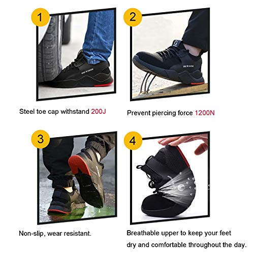 √Dieser Sicherheitsschuh bietet Ihnen einen guten Schutz. -Dieser sportliche Sicherheitsschuh mit seinem jungen, modischen Look sowie erstklassigen Tragekomfort spricht er ein breites Publikum an.Sie minimieren den Schaden, der durch herabfallende oder fallen gelassene Gegenstände oder anderem verursacht wird. -Dieser Sicherheitsschuh mit Mode und umfassender Funktion kann zum Wandern, Wandern, Outdoor-Nutzung, Bau, Arbeiten, Outdoor-Sport usw. verwendet werden. -Die Sohle ist ebenfalls durch Stahl gesichert und schützt so vor scharfen Dingen am Boden, sodass sie die Sohle nicht durchdringen. Zusätzlich hat die Ferse energieabsorbierende Eigenschaften, um Ihre Ferse vor Schaden zu bewahren. Ihre Füße sind sprichwörtlich von oben bis unten geschützt.