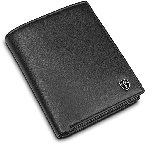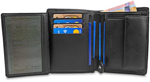 Du suchst nach einem klassischen Geldbeutel mit Top Verarbeitung und gutem Preis/Leistungsverhältnis? Mit dem Portemonnaie „DUBLIN“ von Travando bringst du bis zu 15 Karten und Geldscheine in einem schmalen, bezahlbaren Geldbeutel unter. Das Besondere an diesem Herrenportemonnaie ist das schlichte Design. Oberflächenmaterial ist in einem satten Schwarz gehalten, das von einem graphitgrauen Innenfutter kontrastiert wird. Mit dem Travando Kartenetui hast Du: Platz für bis zu 15 Kreditkarten RFID-Schutz für alle 15 Kreditkarten Platz für bis zu 500 Euro Geldscheine Ein großes Münzfach Zwei Ausweisfächer mit Sichtfenster Besondere Merkmale: Eingestanztes Logo RFID-Schutz Schlankes Design RFID-Schutz Die RFID-Schutzfolie verhindert das Auslesen sensibler Daten durch Unbefugte. Mit der RFID-Technik (Radio-Frequency-Identification-Technik) lassen sich per Funk Daten auslesen, die sich auf Chips von Kreditkarten, Personalausweis, Krankenkassenkarte etc. befinden. Um dies zu unterbinden, blockiert die zwischen Obermaterial und Futter eingearbeitete Folie den Funkkontakt. Abmessungen: Maße: 12,5 x 9,8 x 1,4 cm (geschlossen und leer) Gewicht: 85 Gramm (Leergewicht) Das Portemonnaie eignet sich super als Geschenk zum Vatertag, Geburtstag, Valentinstag, Weihnachten, Ostern oder Du beschenkst Dich einfach selbst damit. Leg das Portemonnaie jetzt in den Einkaufswagen und sorge für einen edlen Auftritt!
