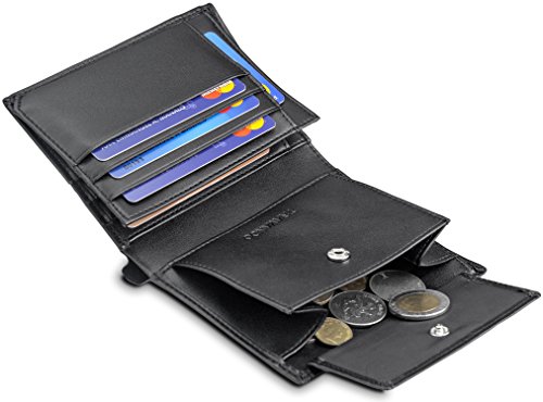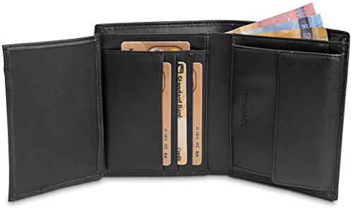 Du suchst nach einem klassischen Geldbeutel mit viel Stauraum? Mit dem Portemonnaie von Travando bringst du bis zu 25 Karten und Geldscheine in einem großen, bezahlbaren Geldbeutel unter. Das Besondere an diesem Herrenportemonnaie ist das schlichte Design. Oberflächenmaterial ist in einem satten Schwarz gehalten, das von einem graphitgrauen Innenfutter kontrastiert wird. Mit dem Travando Geldbeutel hast Du: Platz für bis zu 25 Kreditkarten RFID-Schutz für alle 25 Kreditkarten Platz für bis zu 500 Euro Geldscheine Ein großes Münzfach Ein Ausweisfach mit Sichtfenster auch für KFZ-Schein, altem Perso und Führerschein Besondere Merkmale: Metall Emblem RFID-Schutz Großer Stauraum RFID-Schutz Die RFID-Schutzfolie verhindert das Auslesen sensibler Daten durch Unbefugte. Mit der RFID-Technik (Radio-Frequency-Identification-Technik) lassen sich per Funk Daten auslesen, die sich auf Chips von Kreditkarten, Personalausweis, Krankenkassenkarte etc. befinden. Um dies zu unterbinden, blockiert die zwischen Obermaterial und Futter eingearbeitete Folie den Funkkontakt. Abmessungen: Maße: 12,7 x 10,5 x 2,5 cm (geschlossen und leer) Gewicht: 78 Gramm (Leergewicht) Das Portemonnaie eignet sich super als Geschenk zum Vatertag, Geburtstag, Valentinstag, Weihnachten, Ostern oder Du beschenkst Dich einfach selbst damit. Leg das Portemonnaie jetzt in den Einkaufswagen und sorge für einen edlen Auftritt!