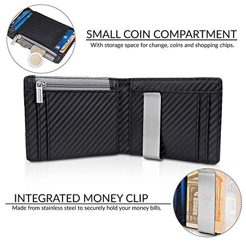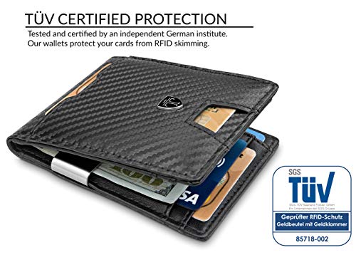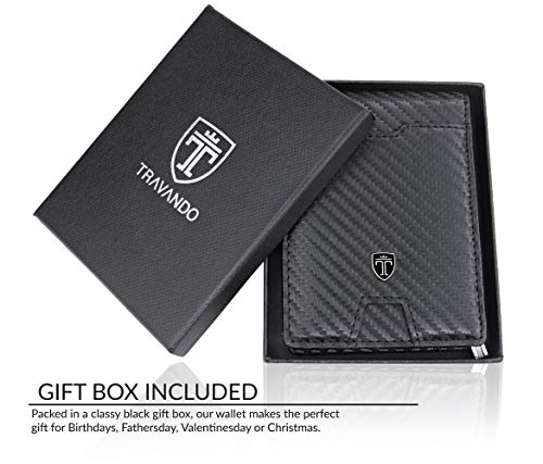 Schnauze voll von dem dicken Geldbeutel, der deine Hosentasche ausbeult? Mit dem Kreditkartenportemonnaie von Travando bringst du bis zu 16 Karten und Geldscheine in einem schmalen Kartenetui unter. Das Besondere an diesem Herrenportemonnaie ist das edle Aussehen. Oberflächenmaterial einem satten Carbon. Dazu kommt die silberfarbene Geldklammer und ein praktisches Münzfach, das den Geldbeutel vollkommen macht. Mit dem Travando Kartenetui hast Du: Platz für bis zu 16 Karten RFID-Schutz für alle 16 Karten Platz für einige Geldscheine Besondere Merkmale: Eingestanztes Logo RFID-Schutz Silberfarbener Geldclip Münzfach RFID-Schutz Die RFID-Schutzfolie verhindert das Auslesen sensibler Daten durch Unbefugte. Mit der RFID-Technik (Radio-Frequency-Identification-Technik) lassen sich per Funk Daten auslesen, die sich auf Chips von Kreditkarten, Personalausweis, Krankenkassenkarte etc. befinden. Um dies zu unterbinden, blockiert die zwischen Obermaterial und Futter eingearbeitete Folie den Funkkontakt. Abmessungen: Maße: 11 x 8,5 x 1,5 cm (geschlossen und leer) Gewicht: 70 Gramm (Leergewicht) Das Kreditkarten-Etui eignet sich super als Geschenk zum Vatertag, Geburtstag, Valentinstag, Weihnachten, Ostern oder Du beschenkst Dich einfach selbst damit. Leg das Kreditkarten-Etui jetzt in den Einkaufswagen und beseitige die Beule in der Hose(ntasche)!