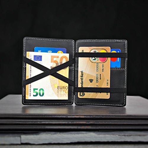 Das besondere Merkmal des Wallets sind die magischen Gummibänder, die das Verstauen von Geldscheinen zu einem echten Zaubertrick machen. Leg einfach den Geldschein auf das Gummiband und klappe das Etui zu. Beim erneuten Öffnen des Etuis befindet sich der Geldschein nun sicher verstaut auf der anderen Seite.
