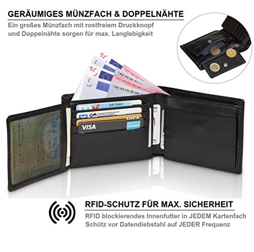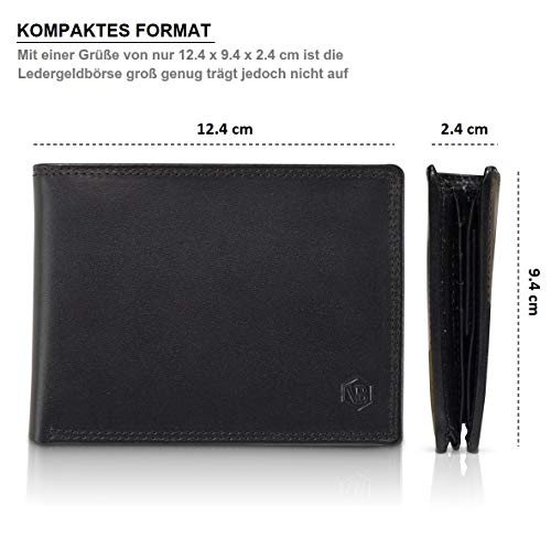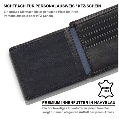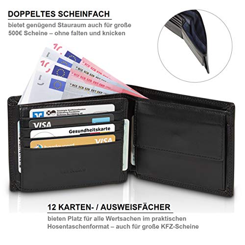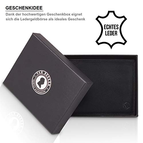 Sie suchen einen Herrengeldbeutel aus echtem Leder in Luxus Qualität? Das VAN BEEKEN Herren-Portmonaise aus Leder bietet Platz für bis zu 12 Karten – ist schlicht, aber gleichzeitig edel und elegant. Die saubere Verarbeitung und besonders weiches Nappa-Leder sorgen für angenehmen Tragekomfort und einen Vintage Look! Details: Obermaterial: Echtes Nappa-Leder Innenfutter: hochwertiger Stoff in Navyblau Platz für bis zu 12 Kreditkarten 1 Ausweisfach mit Sichtfenster 2 getrennte Scheinfächer für jede Scheingröße 1 großes Münzfach mit Druckknopf Kompakte Maße: 12,4 x 9,4 x 2,4 cm Geringes Gewicht: 98 Gramm Was unterscheidet unsere Leder Herren Geldbörse im Querformat von anderen Brieftaschen / Mens Wallets auf Amazon? Garantierter Daten-Schutz: Unser Leder-Geldbeutel schützt Sie auf JEDEM Frequenzbereich vor RFID / NFC Datenenklau. Maximaler Stauraum: Zu kleines Münzfach, überstehende Geldscheine, kein Platz für KFZ-Scheine und „alte“ Personalausweise. Schluss damit! Unser Männer Leder-Portemonnaie / Herren Portmonee ist ein großes Platzwunder im Querformat. Echtleder Männergeldbörse in Premium Ausführung: Einfache Nähte und rostende, kurzlebige Druckknöpfe, steifes Leder, geklebte Geldfächer, billiges Innenfutter & Kunstleder. Das muss nicht sein! Wir setzen dort an wo andere versagen und versprechen hochwertige Van Beeken Marken-Qualität in klassischem Design. Lieferung: 1 x Herren Ledergeldbörse in Geschenkbox