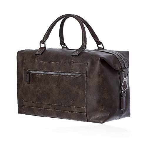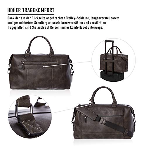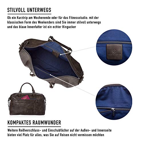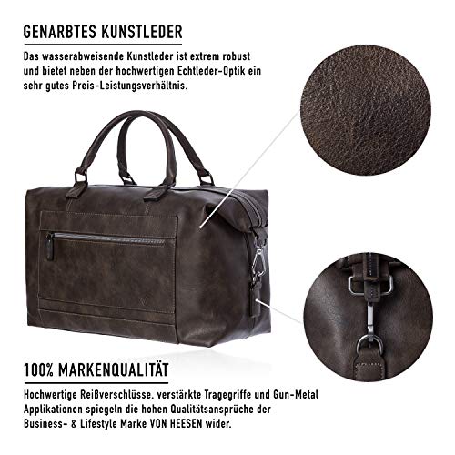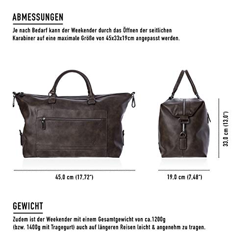 Sie suchen eine graue Handgepäck Reisetasche im Premium Qualität? Der Weekender bietet ausreichend Platz – ist schlicht, aber gleichzeitig edel und elegant.Das wasserabweisende Kunstleder ist extrem robust und bietet neben der hochwertigen Echtleder-Optik ein sehr gutes Preis-Leistungsverhältnis. Bei VON HESSEN erhalten Sie hohe Funktionalität und hochwertiges Design. Ihre Vorteile im Überblick: Details: Obermaterial: genarbtes Kunstleder (Grau) Innenfutter: edles Navyblau 1 geräumiges Hauptfach mit Zwei-Wege Reißverschluss 2 Reißverschlussfächer im Hauptfach 1 Reißverschlussfach auf der Vorder- & Rückseite Besondere Merkmale: Trolleyschlaufe auf der Rückseite gepolsterter Schultergurt (abnehmbar & längenverstellbar) verstärkte Tragegriffe großer Stauraum Klassisches Design angenehmes Tragegefühl Abmessungen: Maße: 48 x 30 x 20 cm Gewicht: ca. 1.000 Gramm Lieferung: 1 x Weekender-Bag 1 x Schultergurt Geschenkidee: Die Weekendertasche eignet sich perfekt als Geschenk für Damen/Herren, Mutter/Vater, Mama/Papa, Ehemann/Ehefrau oder den besten Freund zu vielen Anlässen (Geburtstag, Ostern, Weihnachten, Vatertag, Hochzeitstag, Valentinstag) oder Sie beschenken sich einfach selbst. Legen Sie die Reisetasche jetzt in den Einkaufswagen und sorgen jederzeit für einen stilvollen & eleganten Auftritt!