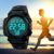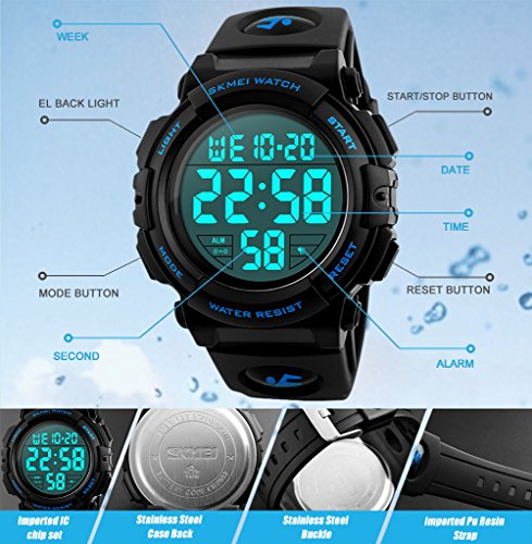 Herren Digitale Sportuhr, Outdoor Laufen 5 Bar wasserdichte militärische Uhren, Cool Sport große Anzeige Handgelenk LED Uhr mit Wecker für Herren Highlights: -Importiertes digitales Uhrwerk -Elektrische Hintergrundbeleuchtung -12 Stunden/24 Stunden Format unterstützt (militärische Zeit) -Kalender mit Datum, Woche, Monat -Wecker enthalten -Stoppuhr enthalten -Stoßresistent -5 Bar wasserdicht: 164ft/50M (wasserdicht auf Lebenszeit, nicht geeignet für langzeit Aktivitäten unter Wasser, wie z. B. Tauchen. Bitte drücken Sie KEINE Knöpfe unter Wasser.) Material: -Gehäuse: PU -Armband: PU -Fenster: Hochtransparentes Harzfenster Spezifikation: -Farbe Ziffernblatt: Schwarz + Blau -Durchmesser Gehäuse: 1.96 inch/50 mm -Dicke Gehäuse: 0.66 inch/17 mm -Farbe Armband: Schwarz -Breite Armband: 0.94 inch/24 mm -Länge Armband: 10.03 inch/255 mm -Handgelenk maximal: 9.25 inch / 235 mm (Buckle to Hole) -Handgelenk minimal: 6.69 inch / 170 mm -Verschlusstyp: Schnalle -Gesamtgewicht: 2.12 oz/60 g **Achtung**: -Bitte KEINEN Knopf UNTER WASSER drücken. Vermeiden Sie die Benutzung in extremer Hitze oder Kälte. -Es wird empfohlen das Armband regelmäßig mit einem weichen Tuch zu säubern. -Übermäßiger Wasserkontakt kann die Lebenszeit der Uhr verkürzen.